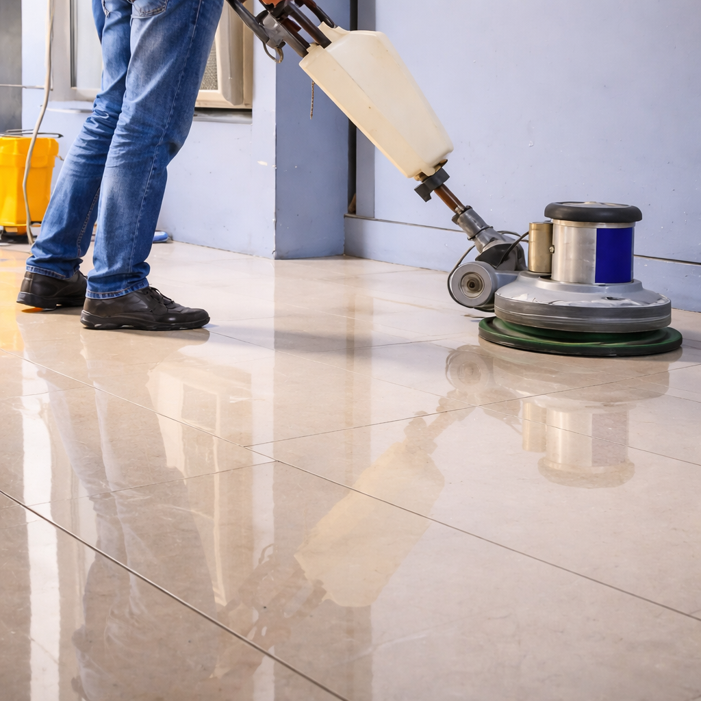 O polimento devolve o brilho e a estética do piso, deixando a superfície mais uniforme e visualmente agradável.